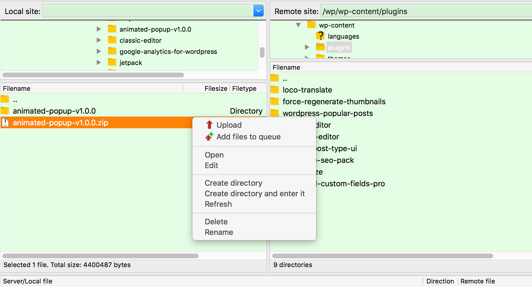 Open the FTP client on your computer and connect to your website using the login credentials provided by your web host. Once connected, you need to go to the /wp-content/plugins/ folder on your website.