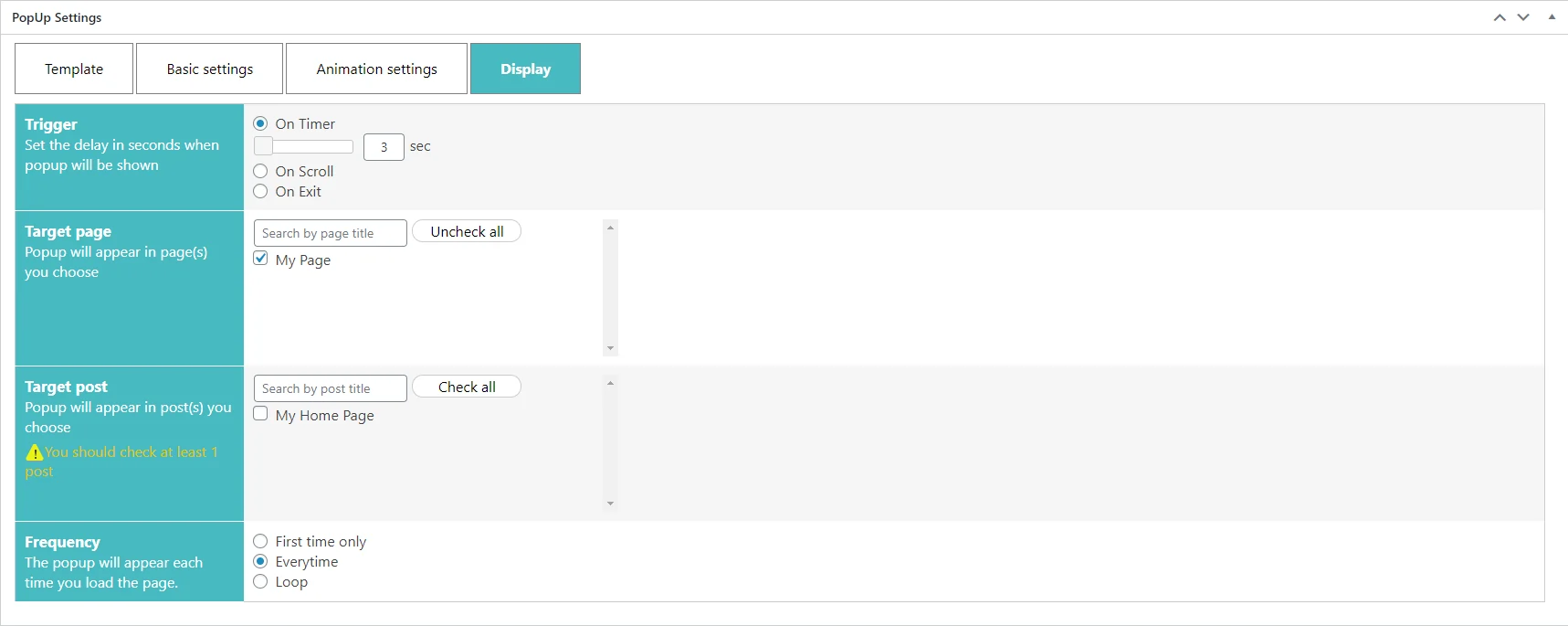 Select targeting pages/posts for your popup and configure the ways it'll be displayed.